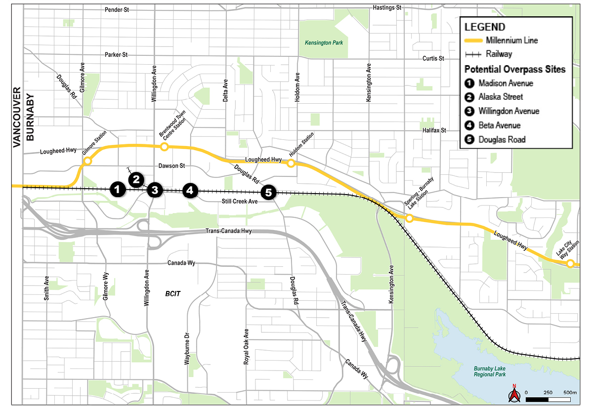 The City of Burnaby is reviewing 5 potential locations for a pedestrian and cyclist overpass across the active railway in the Brentwood neighbourhood, as identified in the Brentwood Town Centre Development Plan: Madison Avenue, Alaska Street, Willingdon Avenue, Beta Avenue, and Douglas Road. The goal is to create a network that is attractive, comfortable and safe for people of all ages and abilities.